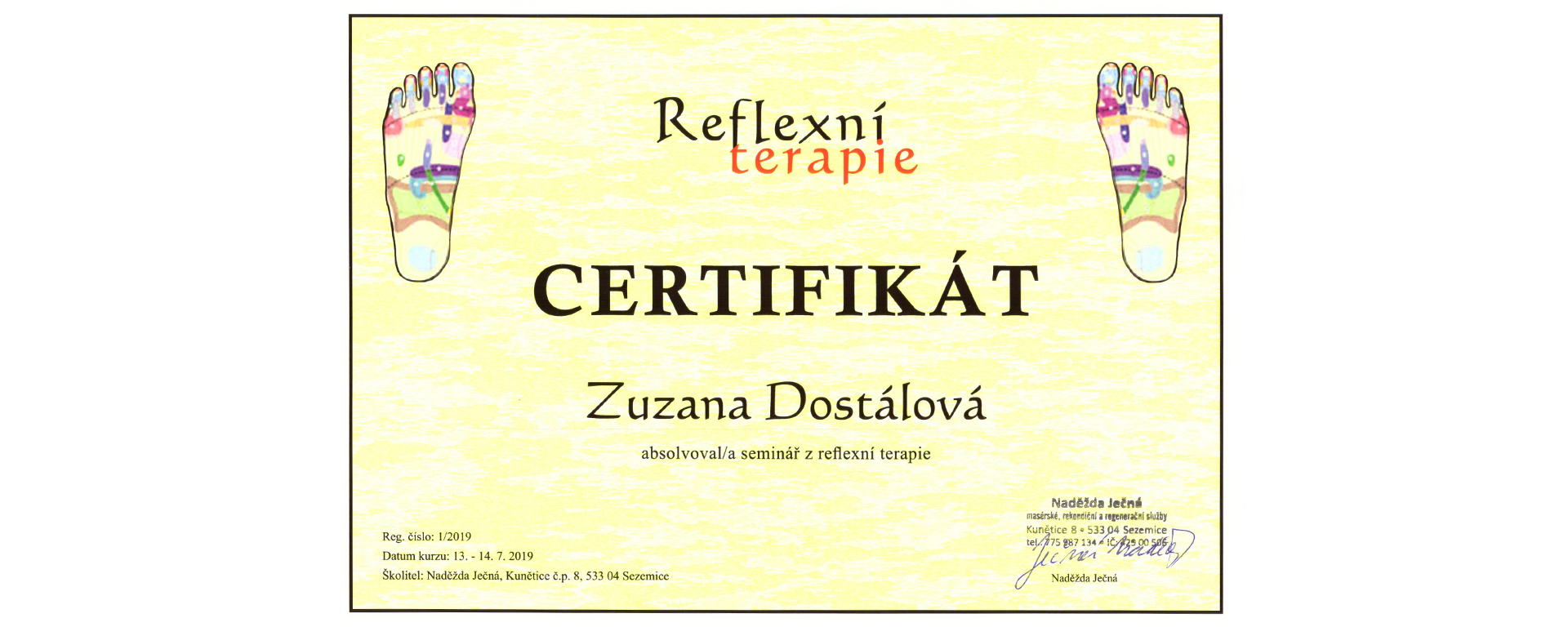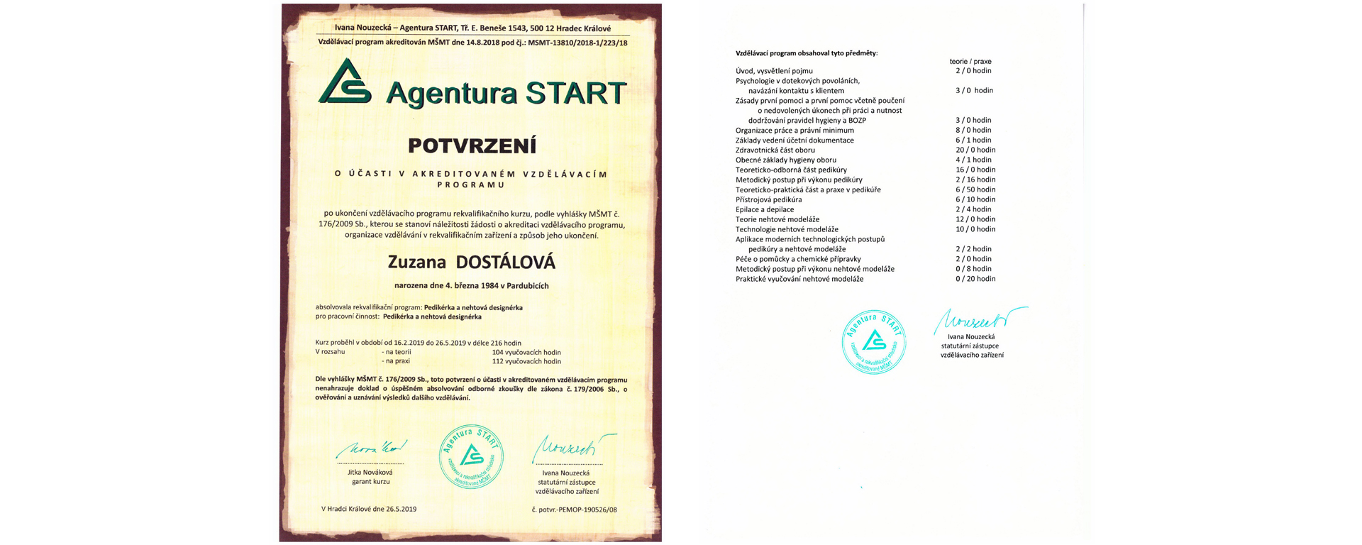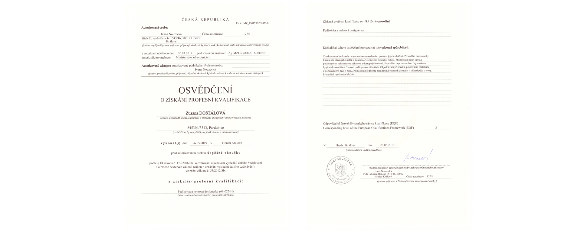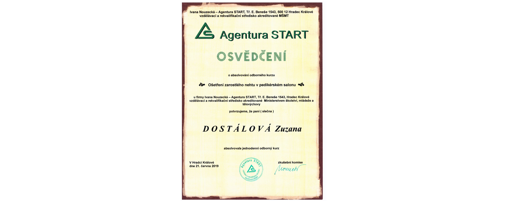 Svoji práci mám velice ráda a mým zájmem je stále se rozvíjet a zlepšovat. Kurz pedikúry jsem absolvovala u paní Ivany Nouzecké v Hradci králové. Masáž plosky nohou mne učila paní Naďa Ječná z Kunětic. Doplňující kurzy opět u paní Ivany Nouzecké a od Profi pedikúry Ostravy v Praze.